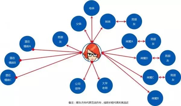 整理出目标女生的社交关系图,如图所示。从这张图可以清楚的发现某个女生的社会关系,有些是可以利用的,是盟友,而有些却是要防备的。