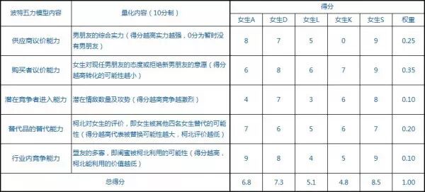 成功机会分析,柯北运用了波特五力分析模型对五位女生进行了量化分析。如图所示,从目标女生的男朋友、目标女生本人、潜在的追求者、柯北自己、盟友五个方面进行了打分评估,得分越低说明该女生越容易被追到手。