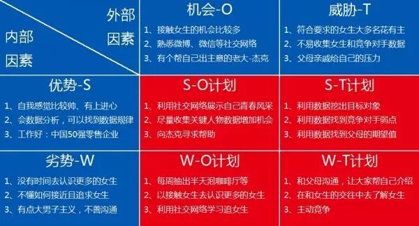 柯北还需要搞明白两个问题(What),其一是自己到底需要找一个什么样的女朋友,其次是自己的优势和劣势。前者柯北使用了人-货-场的逻辑。后者用了SWOT分析法。又是一个通宵,终于整理出两张图。整理完后他伸了一个懒腰,然后兴奋地向空中大喊了一声,comeon,baby!