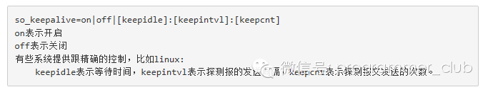 从代码的上下文我发现TCP KeepAlive可以配置,所以我接着查找通过哪个选项配置,最后发现listen指令的so_keepalive选项能对TCP socket进行KeepAlive的配置。