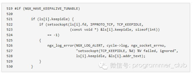 所以搞清楚TCP层的KeepAlive和HTTP的Keep-Alive之后,就不会对于Nginx的KeepAlive设置错。我当时解决这个问题时候不确定Nginx有配置TCP keepAlive的选项,于是我打开Ngnix的源代码,在源代码里面搜索TCP_KEEPIDLE,相关的代码如下: